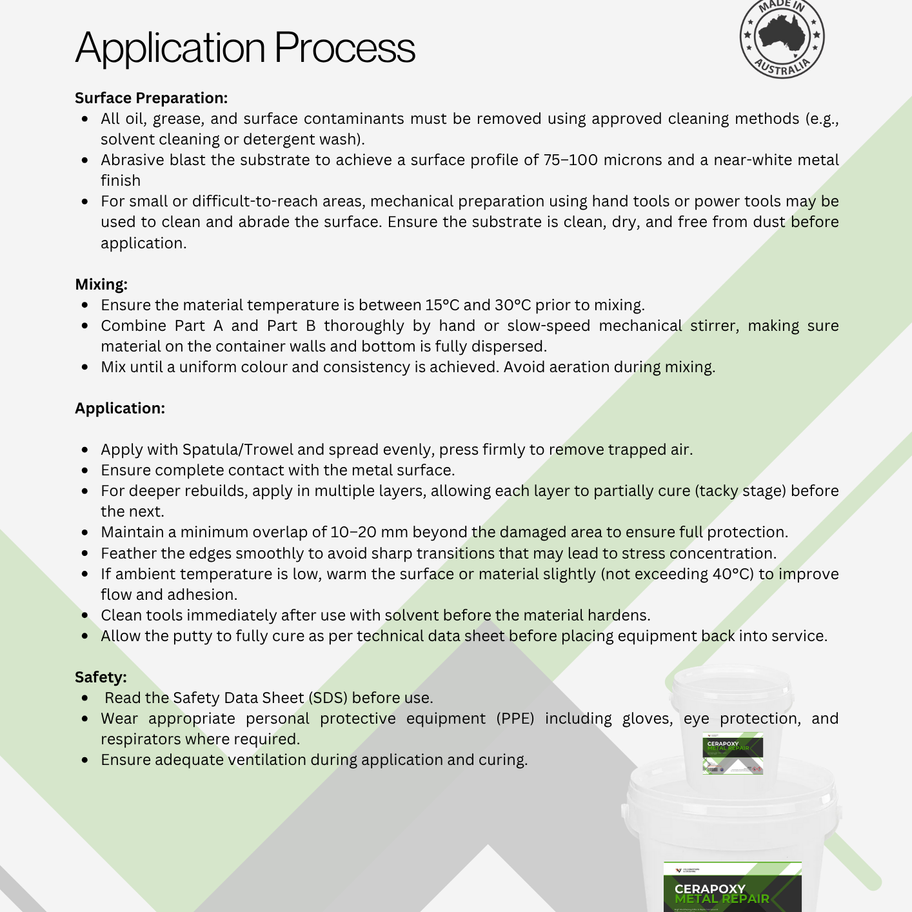 Cerapoxy Metal Repair is a high-performance, alumina-filled ceramic putty engineered to rebuild, restore, and protect metal surfaces exposed to severe wear, abrasion, and erosion. Its smooth, workable consistency makes it ideal for repair applications between 1–10 mm, delivering precision, durability, and long-term protection. For added performance, repaired surfaces can be overcoated with Cerapoxy Ceramic.